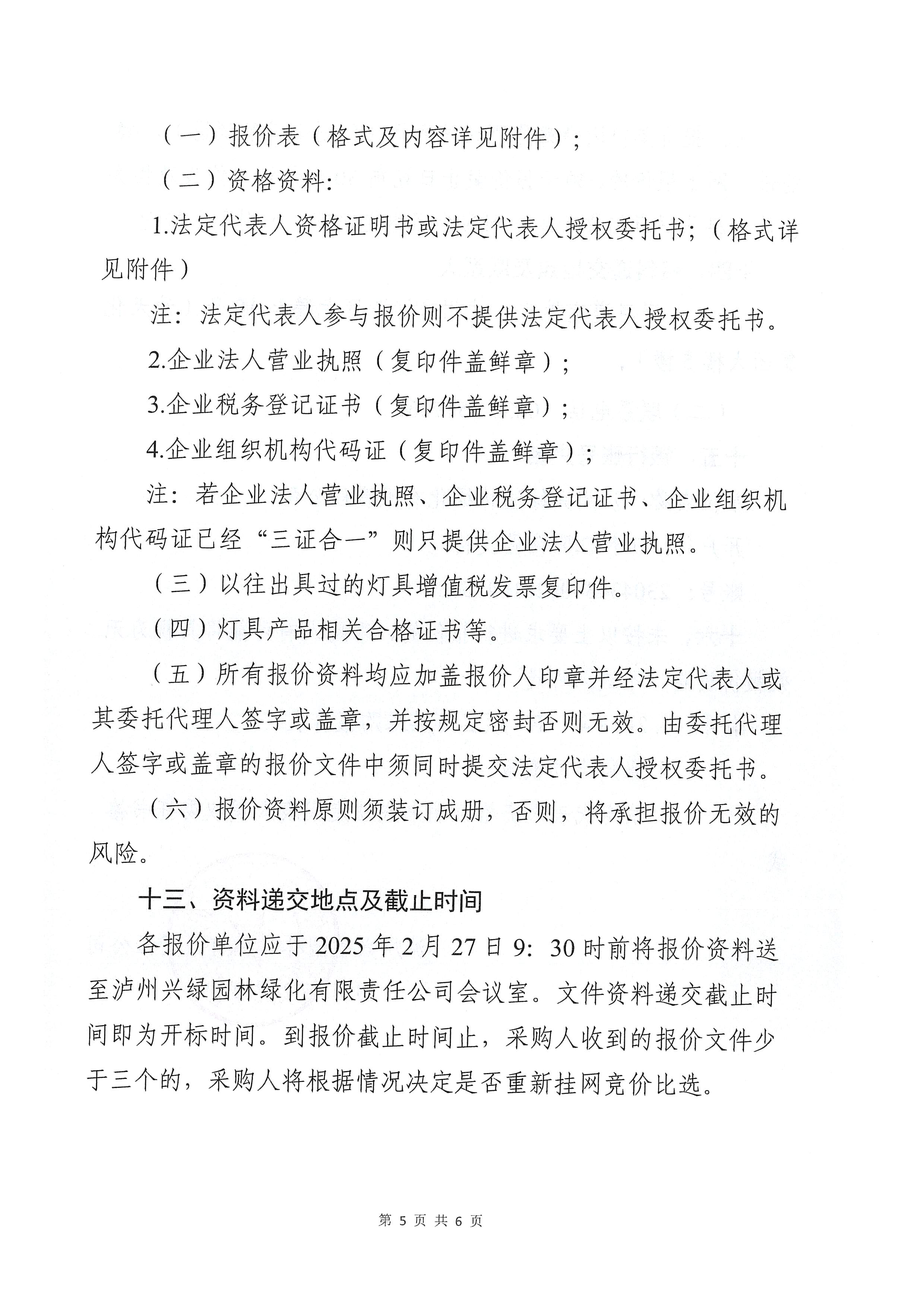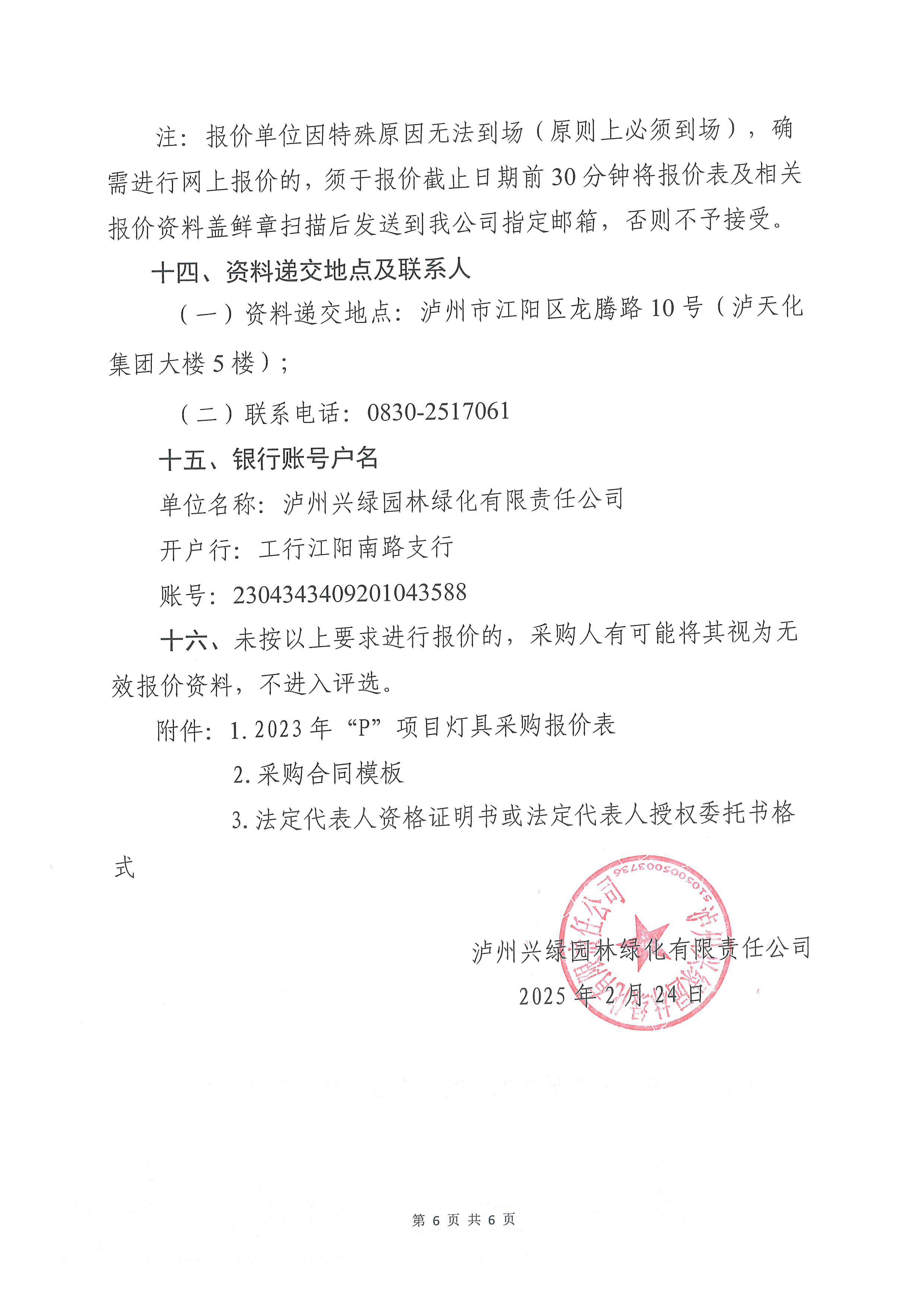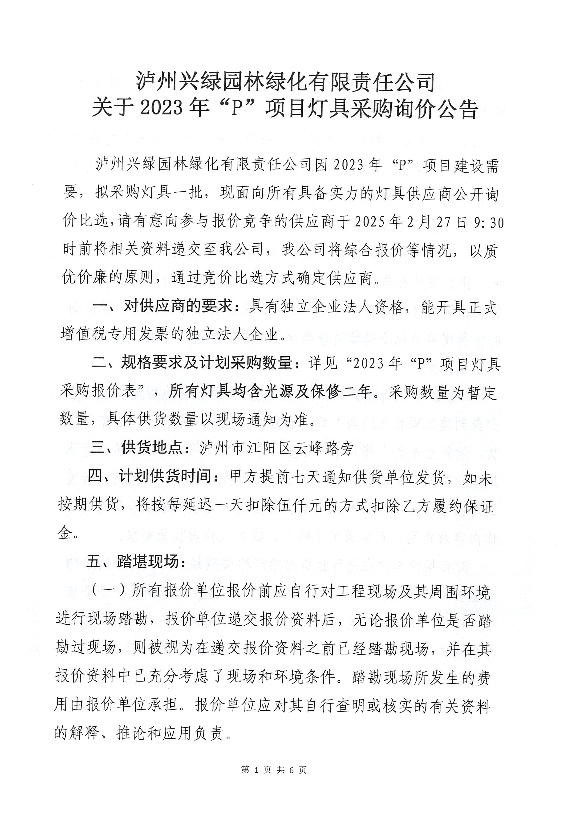 瀘州興綠園林綠化有限責(zé)任公司關(guān)于2023年“P”項目燈具采購詢價公告
