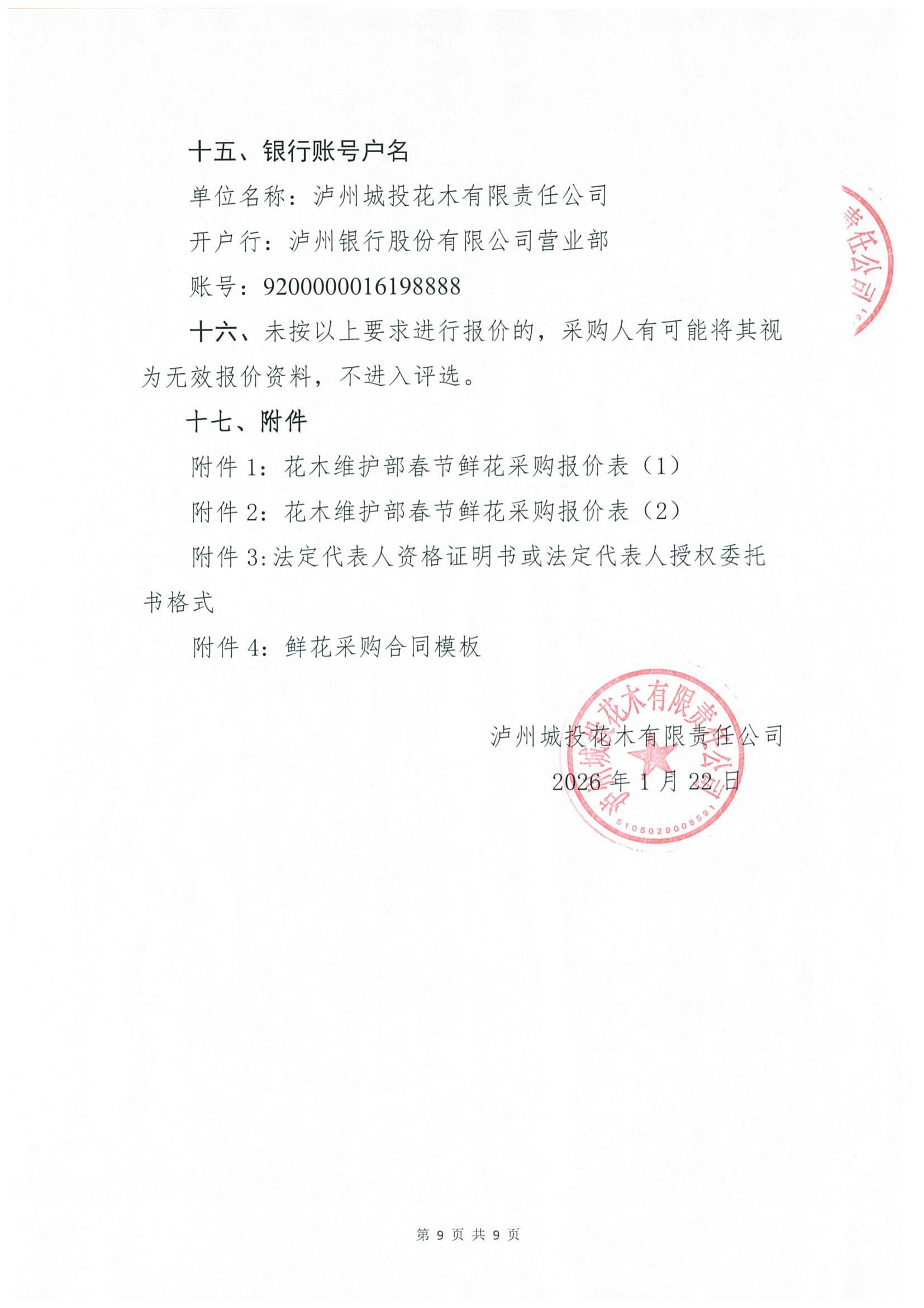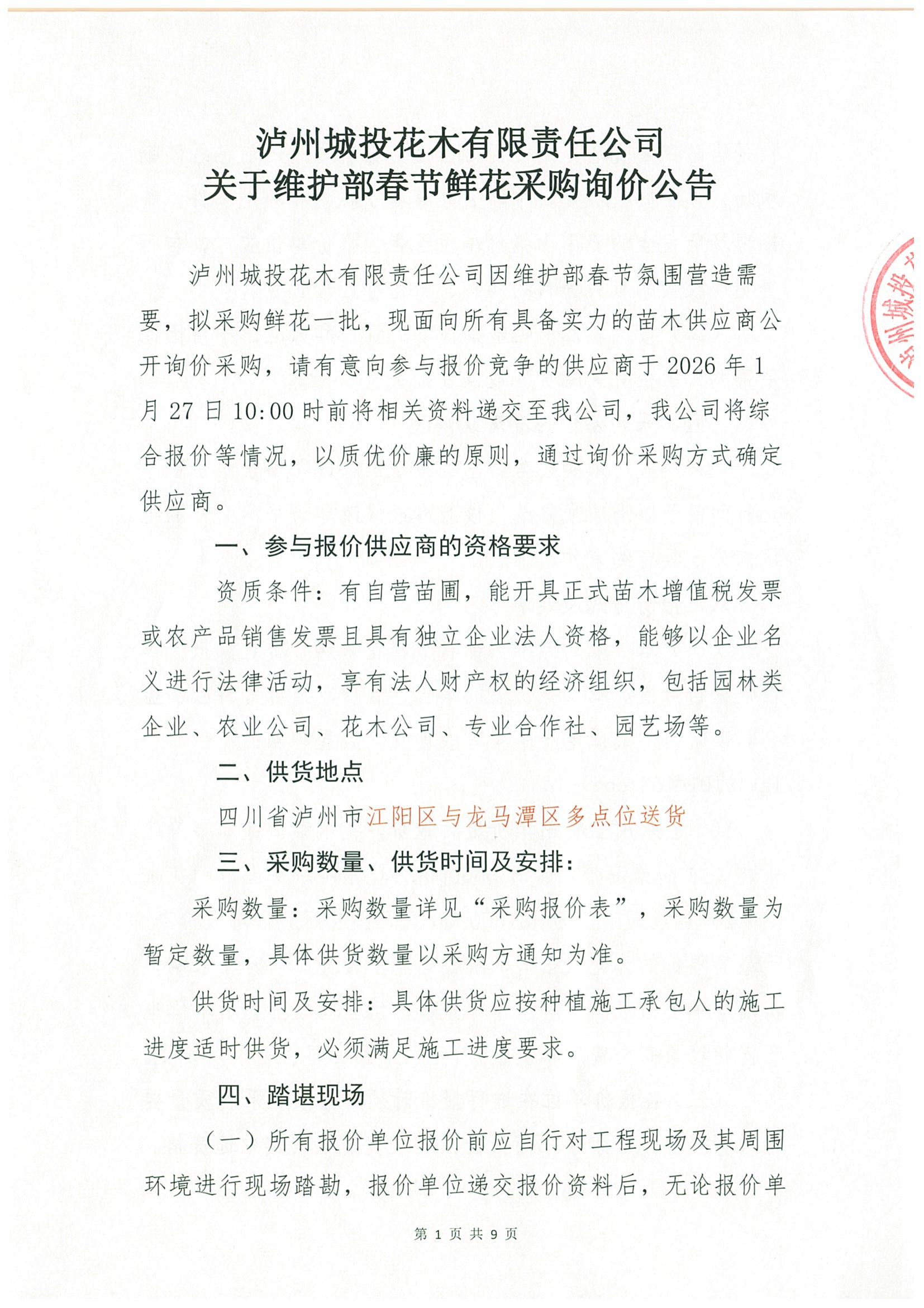 瀘州城投花木有限責任公司 關于維護部春節(jié)鮮花采購詢價公告
